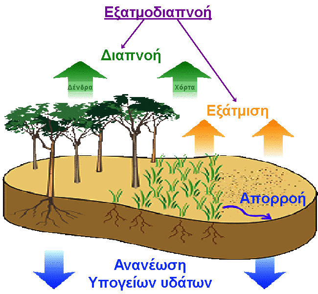 Εξατμοδιαπνοή (ΕΔ) Η εξάτμιση και η διαπνοή συμβαίνουν ταυτόχρονα και δεν υπάρχει εύκολος τρόπος διάκρισης μεταξύ των δύο διαδικασιών. Εκτός από την διαθεσιμότητα του νερού στο ανώτερο εδαφικό στρώμα, η εξάτμιση από ένα καλλιεργημένο έδαφος καθορίζεται κυρίως από το κλάσμα της ηλιακής ακτινοβολίας που φτάνει στην επιφάνεια του εδάφους. Αυτό το κλάσμα μειώνεται κατά την περίοδο ανάπτυξης καθώς η καλλιέργεια αναπτύσσεται και το φύλλωμά της σκιάζει όλο και περισσότερο το έδαφος. Όταν η καλλιέργεια είναι μικρή, το νερό χάνεται κυρίως από την εδαφική εξάτμιση, αλλά μόλις η καλλιέργεια αναπτυχθεί καλά και καλύψει πλήρως το έδαφος, η διαπνοή γίνεται η βασική διαδικασία.
