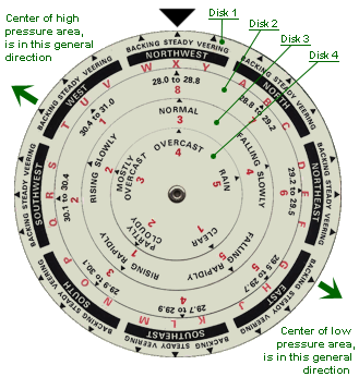Disc 1: Wind direction combined with change (Backing, Steady, Veering) Disc 2: Barometric pressure with a limited number of ranges to select from Disc 3: Rate of change of barometric pressure Disc 4: The current sky conditions |