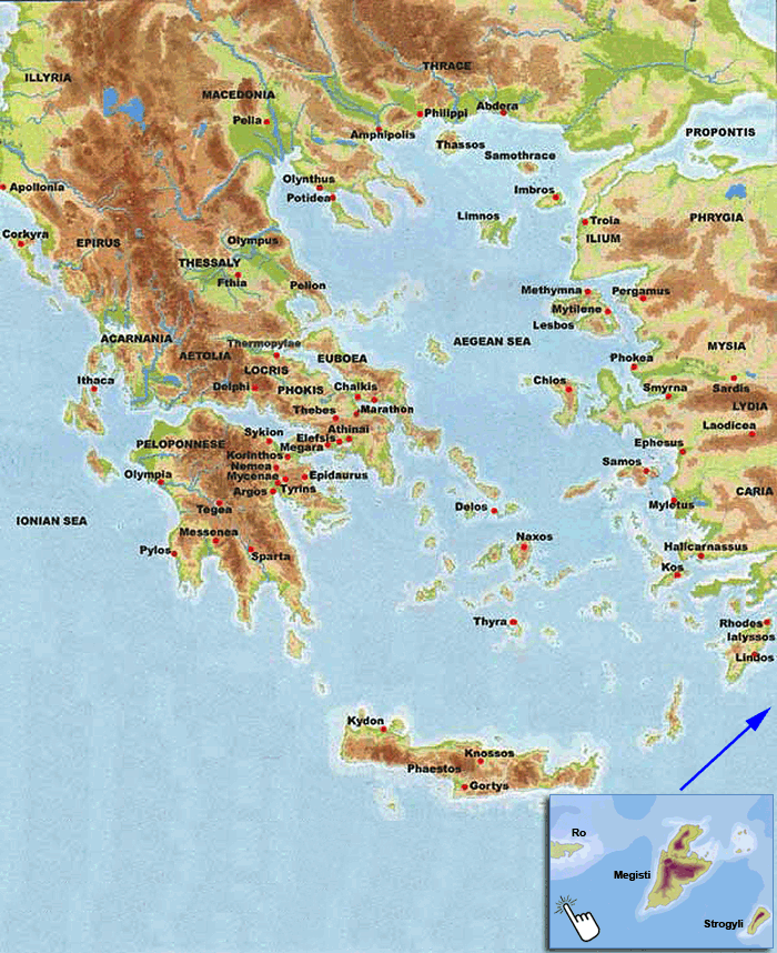 Γεωφυσικός χάρτης της Ελλάδας με τις αρχαίες ονομασίες