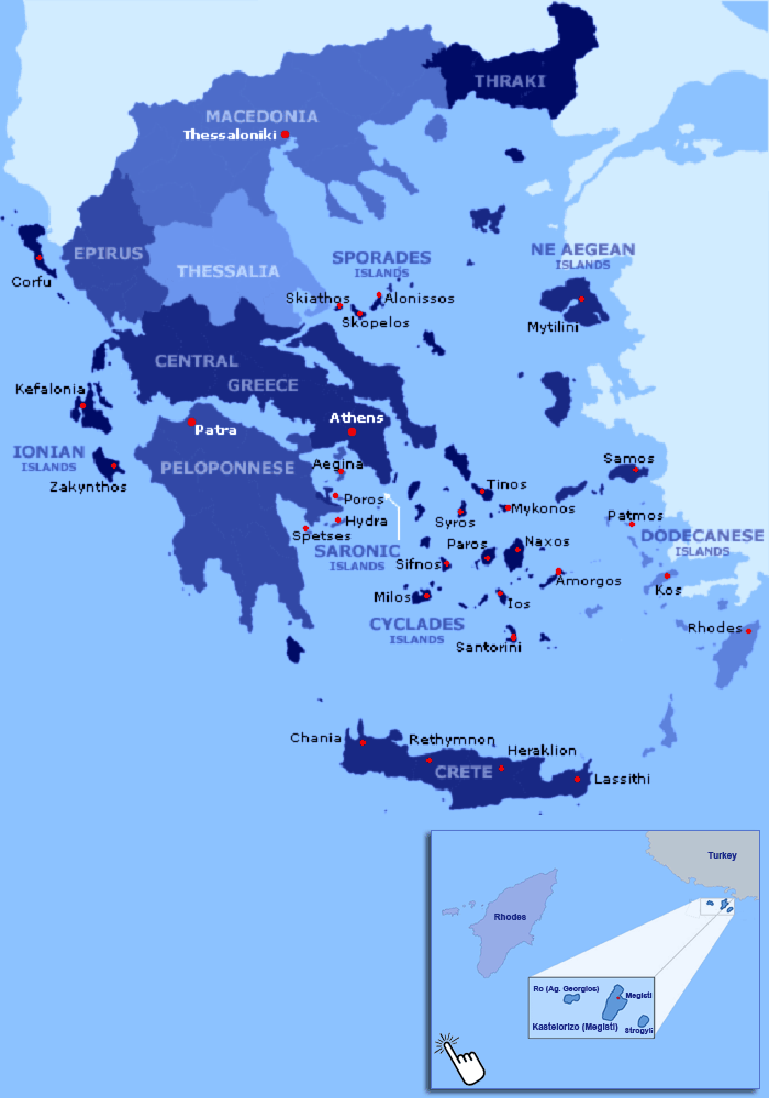Η Ελλάδα, γνωστή και ως Hellas ή Greece και επίσημα Ελληνική Δημοκρατία, είναι μια χώρα στην νοτιοανατολική Ευρώπη, σχηματίζοντας το νότιο άκρο της Βαλκανικής χερσονήσου και είναι μια σειρά από βουνά που διατρέχουν τη θάλασσα, η οποία εκτείνεται σε διάσπαρτα νησιά μέσω του Αιγαίου Πελάγους στα ανατολικά. Η Ελλάδα έχει τη δέκατη μεγαλύτερη ακτογραμμή παγκοσμίως με 14.880 χιλιόμετρα σε μήκος και διαθέτει έναν τεράστιο αριθμό νησιών (περίπου 1.400, από τα οποία τα 227 είναι κατοικημένα). Το ογδόντα τοις εκατό στην Ελλάδα αποτελείται από βουνά, από τα οποία ο Όλυμπος είναι το υψηλότερο με 2.917 μ.