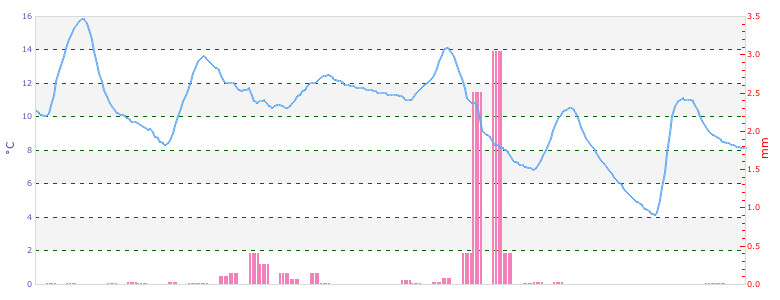 Sunny in the morning, becoming mostly sunny in the afternoon. High 10°. UV index up to 1. Wind north-northwest around 4 kph. |