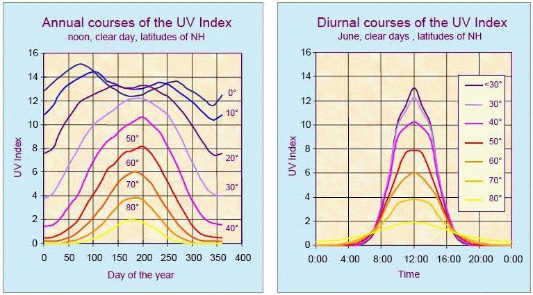 Estimation of global geographical distribution of the UV Index in the summer and winter months at noon, for clear sky.